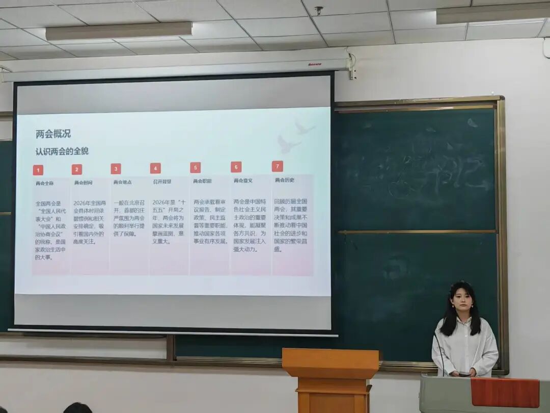 在热烈讨论至于,主讲人也通过图文展示,带领同学们系统梳理了两会的基本知识框架。
