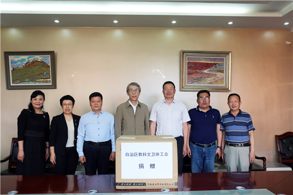 傲木格代表自治区总工会和教科文卫体工会对beat365官网广大教职员工在前一阶段抗击疫情及线上教学取得的成绩和学生错峰梯次开学复课给予了肯定,并向学院赠送了口罩等防疫物资。