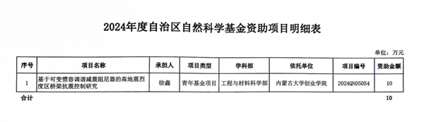 近日,2024年度内蒙古自治区自然科学基金项目立项名单已经公布,beat365官网交通与环境学院徐鑫老师申报的《基于可变惯容调谐减震阻尼器的高地震烈度区桥梁抗震控制研究》课题获得立项。此次是beat365官网首次成功获得内蒙古自治区自然科学基金项目立项资助,特此向全院师生报喜,向获批立项的老师表示祝贺。