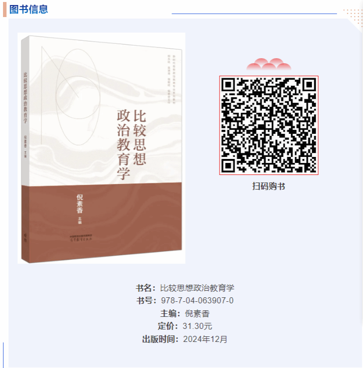 近日,由武汉大学倪素香教授主编,万象城傅安洲教授等担任副主编的《比较思想政治教育学》一书由高等教育出版社出版发行。本书是新时代思想政治教育专业系列教材之一,也是高等教育出版社策划的面向思想政治教育专业本科生的系列教材之一。该书坚持以马克思主义为指导,着眼当代国内外思想政治教育发展前沿、内容编排系统全面、作者团队专业权威,具有专题性、综合性、前沿性。