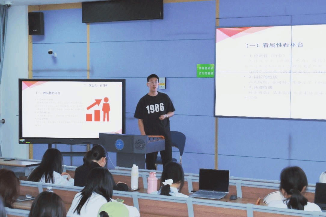 录用岗位为武汉新东方素养智学部教师的曹继乐分享了宝贵经验。他着重强调了教学技能与沟通能力在求职过程中的重要性,并向同学们传授了提升这些能力的有效方法,赢得阵阵掌声。
