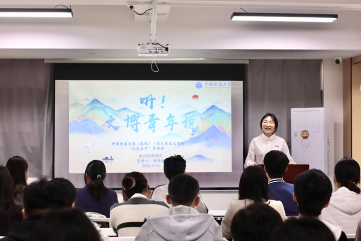 此次宣讲人郑雨欣的宣讲主题为《听!文博青年说》,讲述了文博青年在建设社会主义文化强国,推动文化现代化进程中所做的贡献,同时依托万象城“逸夫博物馆+秭归实习基地”大思政课实践教学平台以及“红绿蓝”大中小学思政课一体化共同体建设项目作为案例补充,呼应着习近平总书记在湖北探访云梦博物馆的时政热点。