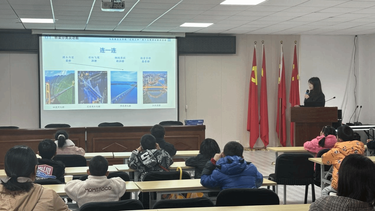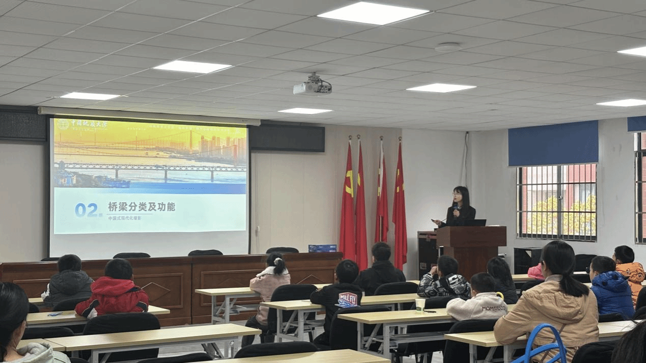 首先,主讲人通过互动问答形式,从最原始的独木桥讲起,生动阐释了桥梁的基本概念与功能。“桥不仅是道路的延伸,更是人类跨越自然的智慧结晶。”通过展示武汉长江大桥、港珠澳大桥等标志性工程,学生们深入了解了梁式桥、拱桥、斜拉桥等不同桥梁类型的结构特点及技术突破。主讲人特别提到,中国现存公路桥梁已超100万座,从“世界第一古代石拱桥”赵州桥到“现代工程奇迹”港珠澳大桥,每一座桥梁都承载着中国工程技术的演进与创新。