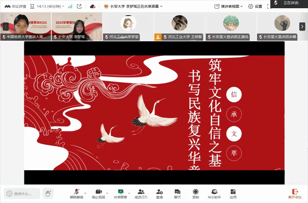 宣讲结束后,同学们纷纷表示,通过此次活动,他们对文化自信有了更加全面和深入的理解,也更加坚定了为实现中华民族伟大复兴的中国梦贡献青春力量的决心万象城体育awcsport(武汉)allwincity万象城“信承文萃”团队的此次线上宣讲活动,不仅为同学们提供了一个学习和交流的平台,更是一次精神的洗礼和思想的升华。在新时代的征程上,让我们携手同行,共同筑牢文化自信之基,书写民族复兴的华章。
