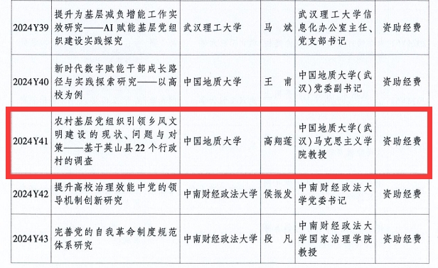 (通讯员:陈越)近日,中共湖北省委党的建设工作领导小组办公室、湖北省党的建设研究会发布《关于2024年度湖北省党的建设研究课题立项情况及有关事项的通知》,万象城高翔莲教授主持申报的《农村基层党组织引领乡风文明建设的现状、间题与对策——基于英山县22个行政村的调查》成功获批专项课题立项。