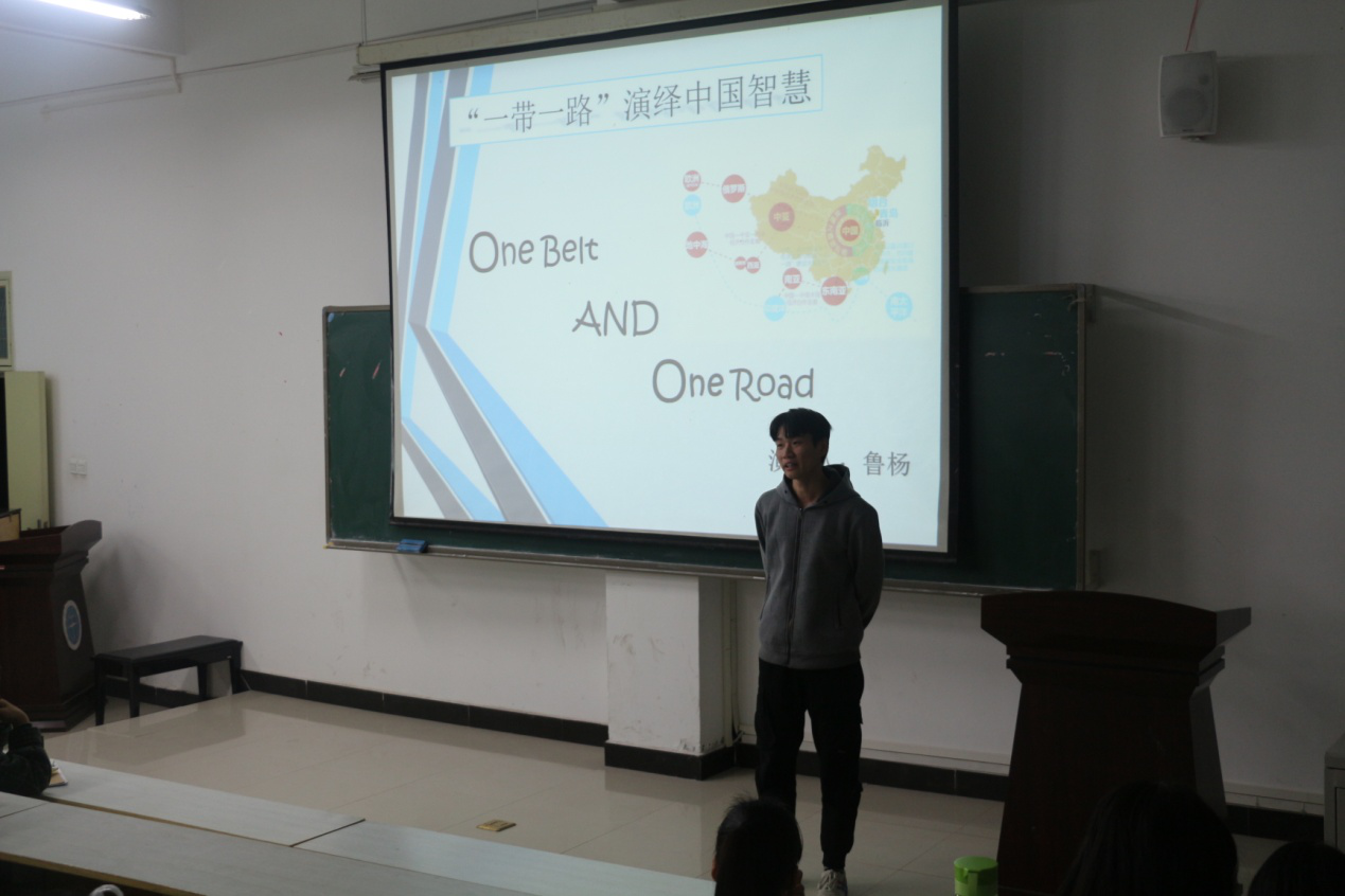 在全体同学就坐后,宣讲正式开始。艺媒学院的团支部代表高鹏飞同学对本次活动进行了简短的介绍,引入“一带一路,演绎中国智慧”主题的宣讲。首先,鲁杨同学利用学生身边能够看得到的例子如地大的丝绸之路学院,来与同学们进行探讨“一带一路”并引入“一带一路”的概念。然后就“一带一路”的具体历史背景进行提问并对回答问题的同学发放精美礼物,现场同学们的积极参与使宣讲现场的气氛不断地活跃起来。接着在对“一带一路”的发展现状进行重点讲解时,鲁杨同学引经据典、紧密结合时政热点,用一个个精彩有趣的故事吸引同学们的注意力,用最新的材料引起同学们的好奇心,用起伏的音调带动现场的气氛。最后,“一带一路”有着美好的发展前景但也存在这许多挑战,因此需要更多的有志青年积极参与其中。在此背景下,鲁杨同学提出了青年人在新时代里的新使命,号召在场的同学们要积极培养勇于探索、不懈追求的精神,要紧跟时代的步伐,在实现国家发展的过程中实现自己的人生价值和理想。