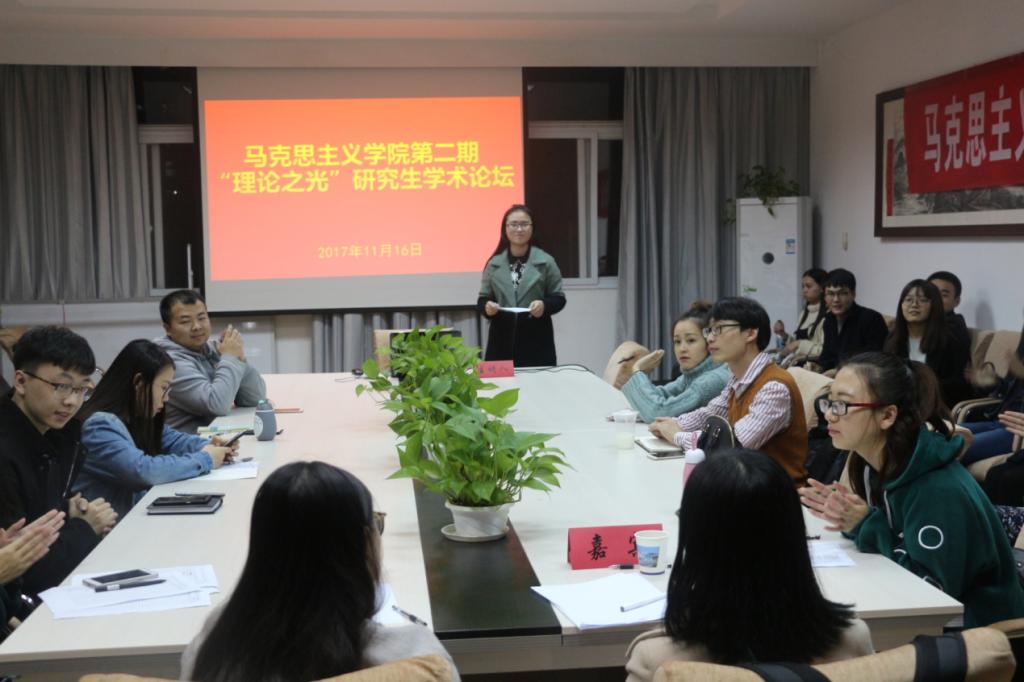 2017年11月16日晚七点,allwincity万象城第二期“理论之光”研究生学术论坛如期举行。allwincity万象城2015级硕士研究生杨静、黄保红作为本期论坛的主讲人,卢微、胡月担任本期论坛的特邀嘉宾。