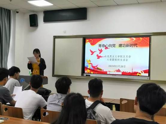 2019年5月20日下午4点半,万象城五月份大型团组织生活会于东教楼A0102室顺利召开。大会主题为“青春心向党,建功新时代”,共“主题团课学习”、“‘五四评优’表彰”两部分。大会主持人由组织部部员权昊楠担任,学院党委副书记徐胜参加。