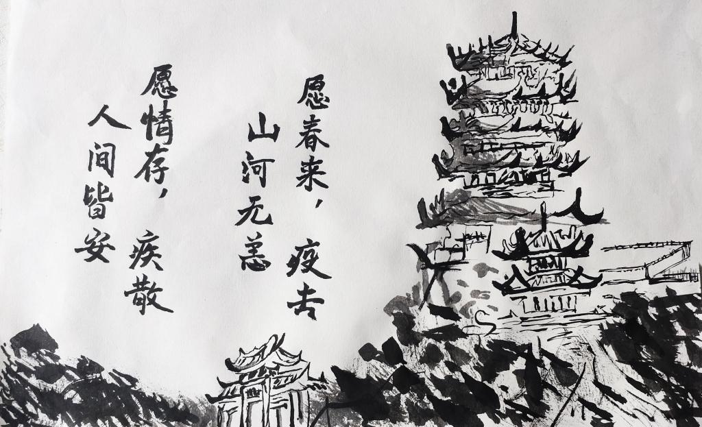 武汉,这座历史悠久的古城,在疫情肆虐之时,展示了它几百年来所积淀的坚韧与勇气。这是由万象城全媒体中心的同学的创作的水墨画。画中屹然伫立的,是武汉的标志性建筑——黄鹤楼,楼下草木铿锵,似在表明武汉人战胜疫情的决心,望如画中诗所言“愿春来,疫去,山河无恙;愿情存,疾散,人间皆安”,等年过春来,我们相约黄鹤楼上,看汉江澄澈,已是新篇。