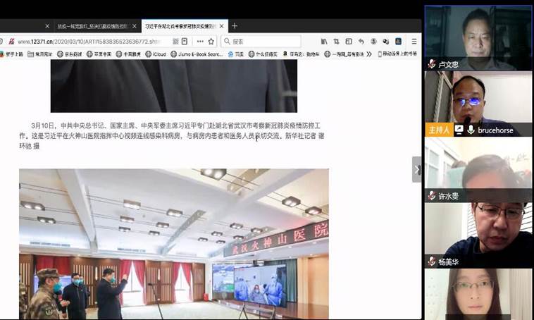 【思想政治教育系党支部】全体党员唱国歌,重温入党誓词。在集中学习习近平总书记系列讲话后,观看了总书记调研视频报道,深化对习近平“我们党在内忧外患中诞生,在磨难挫折中成长,在攻坚克难中壮大。”的讲话精神理解,重温了总书记和党中央对各级党组织和广大党员、干部要不忘初心、牢记使命,扛起责任、经受考验,在这场大考中磨砺责任担当之勇、科学防控之智、统筹兼顾之谋、组织实施之能,做到守土有责、守土有方的工作要求。通过此次主题党日学习,强化了在抗击新冠肺炎疫情的关键时刻的工作认识,对保持头脑清醒,慎终如始,再接再厉、善作善成,不麻痹、不厌战、不松劲,毫不放松抓紧抓实抓细各项防控工作,为坚决打赢湖北保卫战、武汉保卫战各尽其职的信心。最后与会全体党员对思政系下一步的党建工作以及教学工作进行讨论和安排。特别是当前要抓紧敦促指导老师和毕业生完成毕业论文尽快提交初稿,以及做好部分转专业学生的疏导工作。