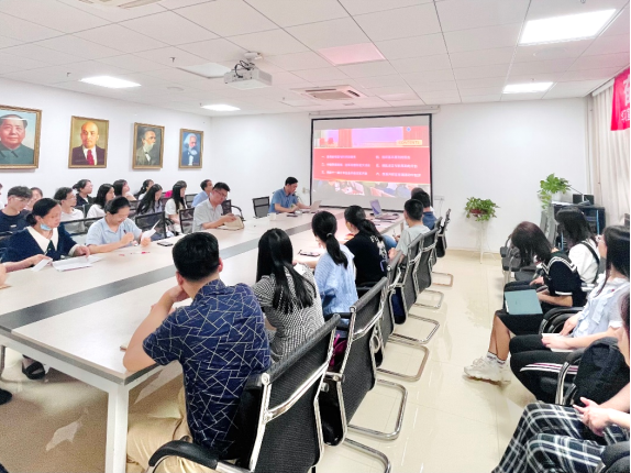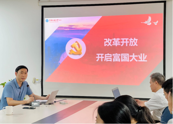 第一项为“师生共学党史”,由阮院长为大家作党史学习教育专题辅导。今年2月,习近平总书记在春节团拜会上说:“我们要认真回顾走过的路,不能忘记来时的路,继续走好前行的路。”知所以来,明所以去。阮院长以“改革开放,富国之路”为主题,围绕着“高考的开放与科学的春天、冲破思想禁锢迎来真理标准大讨论、党的十一届三中全会开启改革开放、四项基本原则的提出、拨乱反正与新局面的开创、改革开放在春潮涌动中起步”六个方面,向在座党员同志讲述了改革开放初期我们党和国家的奋斗历程。从恢复高考,改变一代知识青年的命运,到开展全国范围内的真理标准问题大讨论,从拨乱反正到改革开放,从安徽凤阳小岗村的“大包干”到经济特区的建立,阮院长通过生动的语言讲解和视频展示,让在座党员同志对我们党在改革开放初期的艰苦探索有了更加深刻的认识,同时也有助于学生党员们更好的树立正确的党史观。