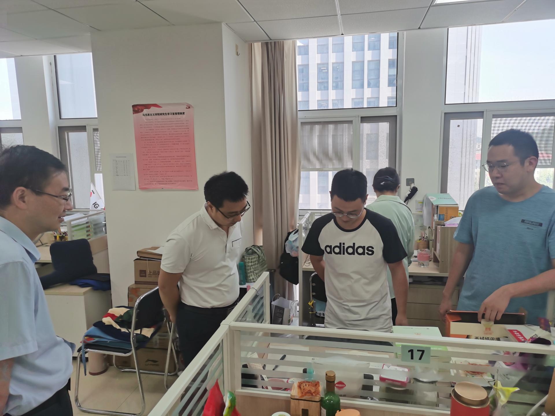 院领导一行先来到9楼916学生自习室,询问留校硕士博士自修研习情况,对学生暑假在校生活进行了解,提醒同学们假期在校注意用电安全并为同学们送上慰问品。