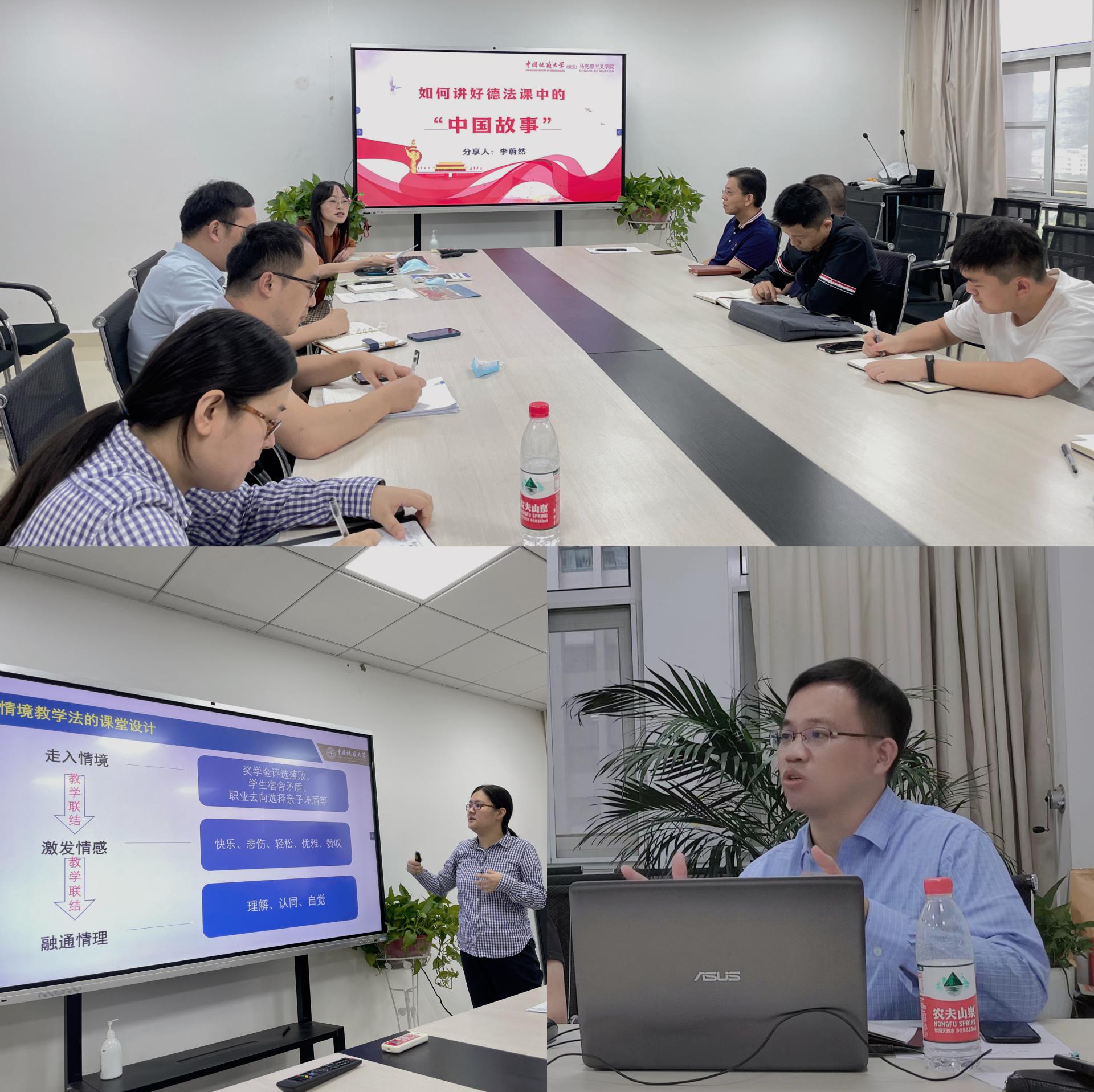 本次备课会由汤凡渺、李蔚然和武彦斌三位老师主讲。汤凡渺老师分享了情境教学法在德法课中的运用,介绍了“走入情境、激发情感、融通情理”的课堂设计基本结构,讲解了“情境创设,情境观摩,情境回顾”的具体案例。她将在学生工作中的具体情境引入课堂,如宿舍矛盾冲突情境、保研失败情境、校友作品爆红情境等,呈现了学生情境如何与教材中的“中国精神、马克思主义关于人的本质的论断、树立正确的人生观”等教学知识点进行联结和延展。
