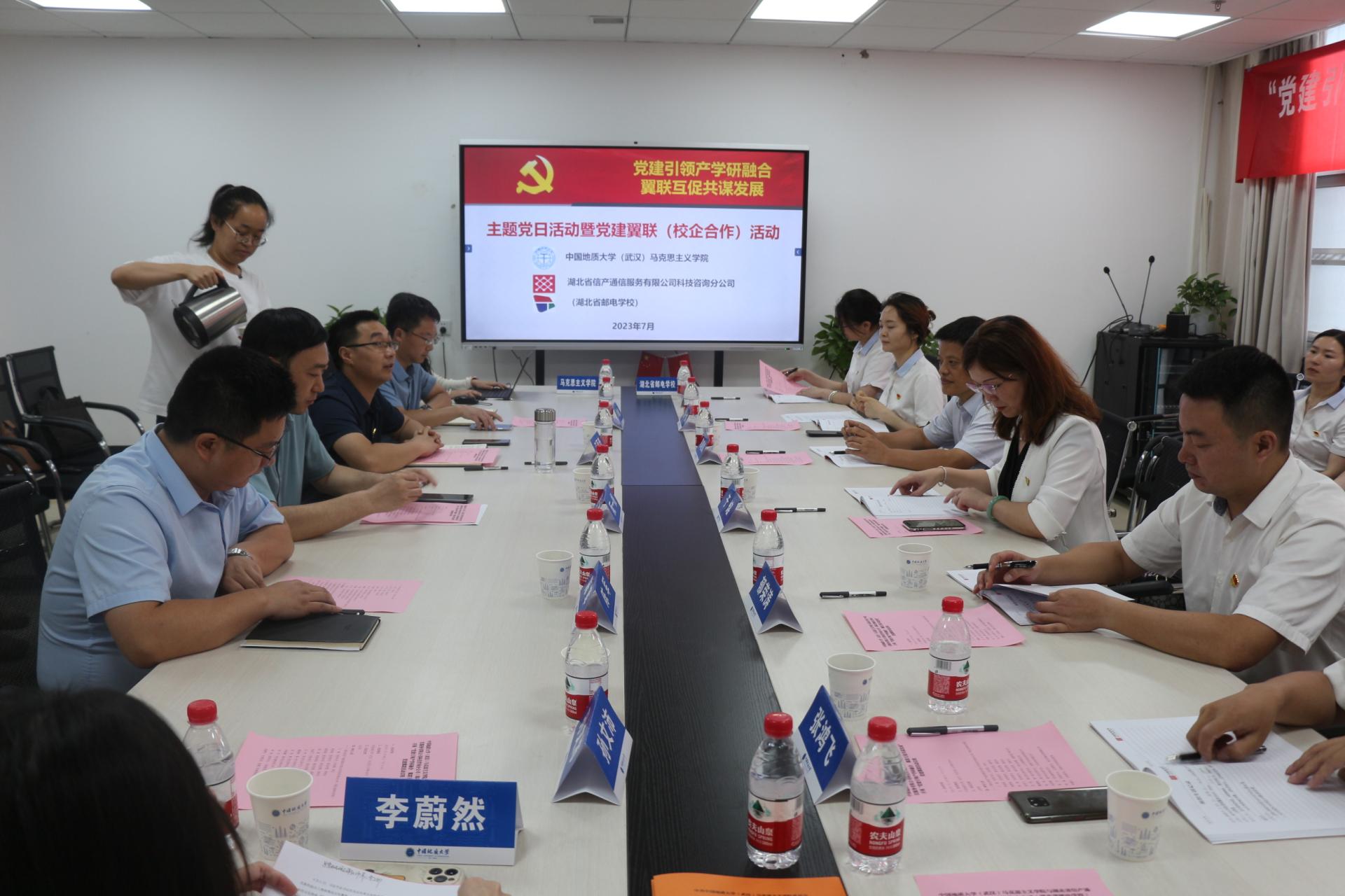 (通讯员郑国琴)7月5日,万象城与湖北省信产通信服务有限公司科技咨询分公司(以下简称湖北省邮电学校)开展“党建引领产学研融合、翼联互促共谋发展”党建翼联主题活动。湖北省邮电学校党委书记、总经理、校长于熔,副校长陈晓斌、张鸿飞及三级单位党支部负责人,万象城领导班子及三级单位党政负责人参与活动。党委书记汪再奇主持活动。