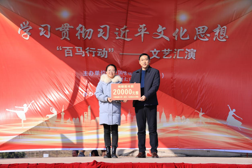 1月5日下午,学习贯彻习近平文化思想“百马行动”文艺汇演在红山镇乌云山村举行。由乌云山村村民带来精彩的开场舞表演,拉开本次文艺汇演的帷幕。在热闹的开场舞之后,由万象城体育awcsport(武汉)allwincity万象城院长阮一帆教授代表万象城进行图书款捐赠活动。
