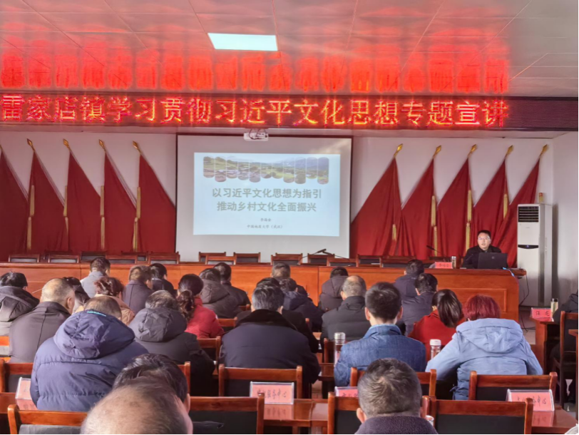 allwincity万象城副院长李海金教授赴雷家店镇开展理论宣讲活动。雷家店镇镇直单位负责人、32个村主要干部参加宣讲会。李海金教授以“以习近平文化思想为指引推动乡村文化全面振兴”为题,围绕充分认识习近平文化思想的重大意义、充分领会习近平文化思想的重大战略、充分把握习近平文化思想的科学方法论三个方面,并结合两个全国典型案例,深刻阐释了习近平文化思想的深刻内涵,让基层党员干部对习近平文化思想有了深入的认识和体会。