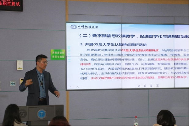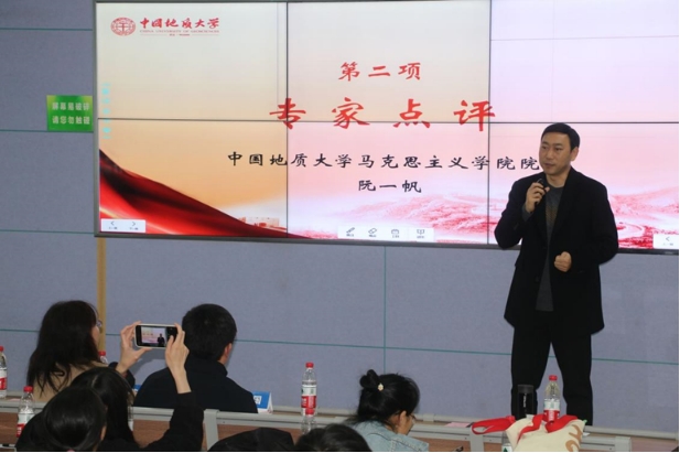 在点评环节,阮一帆院长首先对于两位老师来到地大马院作思政课示范教学展示表示感谢。他表示,两位老师的讲课充分做到了思想性和政治性的统一、内容和形式的统一、灌输性和启发性的统一、演与讲的统一,以其深厚的知识学养、生动活泼的展示形式、紧密结合例证的讲道理方式以及优秀的教态表现,呈现了全国顶尖思政课教师的风采,值得在座各位师生学习。他指出,今年正值“习近平总书记‘3·18’重要讲话发表五周年”,五年来,全国各高校深入学习贯彻习近平总书记重要讲话精神,努力推动思政课高质量发展。重温习近平总书记在学校思想政治理论课教师座谈会上的重要讲话精神,直面当前思政课教学仍存在的诸多问题和不足,结合学校“提质增效年”的工作主题,今年地大马院也是提出了“思政课提质增效”计划,今天的思政课示范教学展示活动就是计划内容之一。