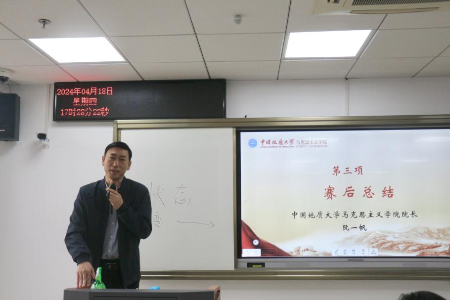 活动最后,阮一帆院长对此次竞赛活动作总结。阮院长首先高度肯定了参赛教师们在此次教学展示中的表现,并对在座专家评委的用心、细致点评以及提出的诸多中肯建议表示感谢。他指出,思政课建设任重道远,思政课教师要以更高的标准来要求自己,充分汲取专家评委的指导建议,对标评委老师提出的各项标准,更好地提升自身的教学能力和育人水平,努力成长为一名优秀的大学思政课教师。