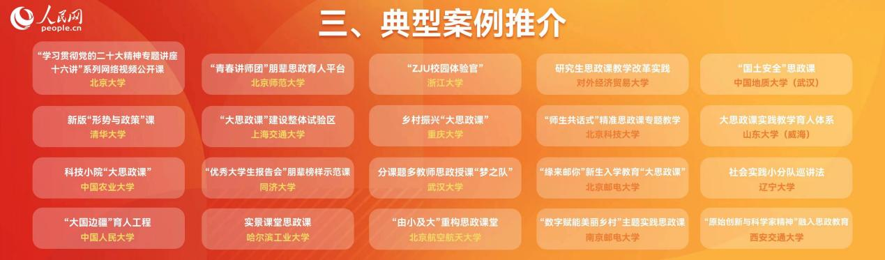 作为国家级大型年度教育论坛,人民网主办的大学校长论坛已成功举办十届,累计600余位大学书记、校长参加研讨,成为凝聚共识、助力中国高等教育改革与发展的年度盛事。《2023年高校思政课改革创新情况分析报告》根据各高校思政课程的社会反响、信息传播量、主流媒体关注度、舆论反馈情况等维度,在全国征集推介“北京大学‘学习贯彻党的二十大精神专题讲座十六讲’系列网络视频公开课”“清华大学新版‘形势与政策’课”“中国人民大学‘大国边疆’育人工程”“万象城体育awcsport‘国土安全’思政课”等20个优秀思政课程案例,以期为各高校思政课改革创新提供借鉴启示。