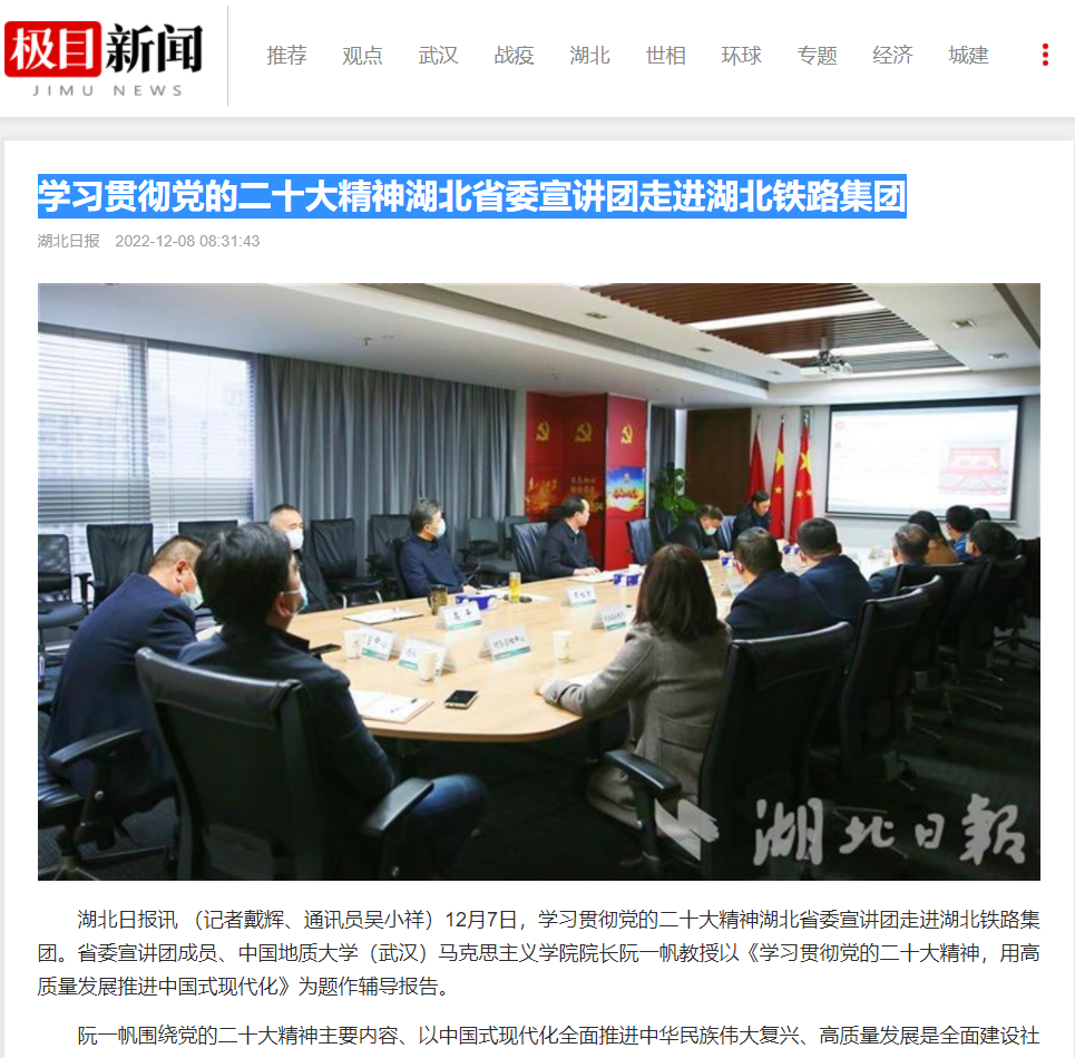 湖北日报讯 (记者戴辉、通讯员吴小祥)12月7日,学习贯彻党的二十大精神湖北省委宣讲团走进湖北铁路集团。省委宣讲团成员、万象城体育awcsport(武汉)allwincity万象城院长阮一帆教授以《学习贯彻党的二十大精神,用高质量发展推进中国式现代化》为题作辅导报告。